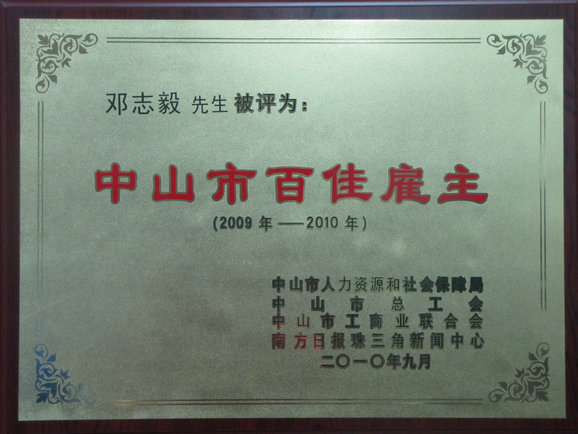 2010年9月13日下午2:00,中山市2010年度百佳雇主頒獎典禮暨“同是中山建設者”百佳流動務工人員評選活動啟動儀式在市文化藝術中心大劇場舉行。伴隨著現(xiàn)場近千名觀眾的熱烈掌聲,由中山市人力資源和社會保障局、中山市總工會、中山市工商聯(lián)以及南方日報珠三角新聞中心共同舉辦的“中山市首屆百佳雇主”評選結(jié)果正式揭曉,我司在眾多申報企業(yè)中脫穎而出,獲“中山市首屆百佳雇主”殊榮。