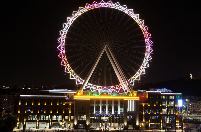 觀覽?是?套?于樓頂經(jīng)歷強臺?“天鴿”襲擊,仍“巋然不動”,安全使?。塔架采?圓管?字?柱結(jié)構(gòu),轉(zhuǎn)盤為輻條式,吊廂懸掛在轉(zhuǎn)盤的外側(cè)?撐架上,造型獨特新穎,轉(zhuǎn)盤結(jié)構(gòu)通透。達到?點時,距離地?的?度可達到108?,將乘客帶到?覽?遺的天空之上,俯視?圓10公?以內(nèi)的景致。