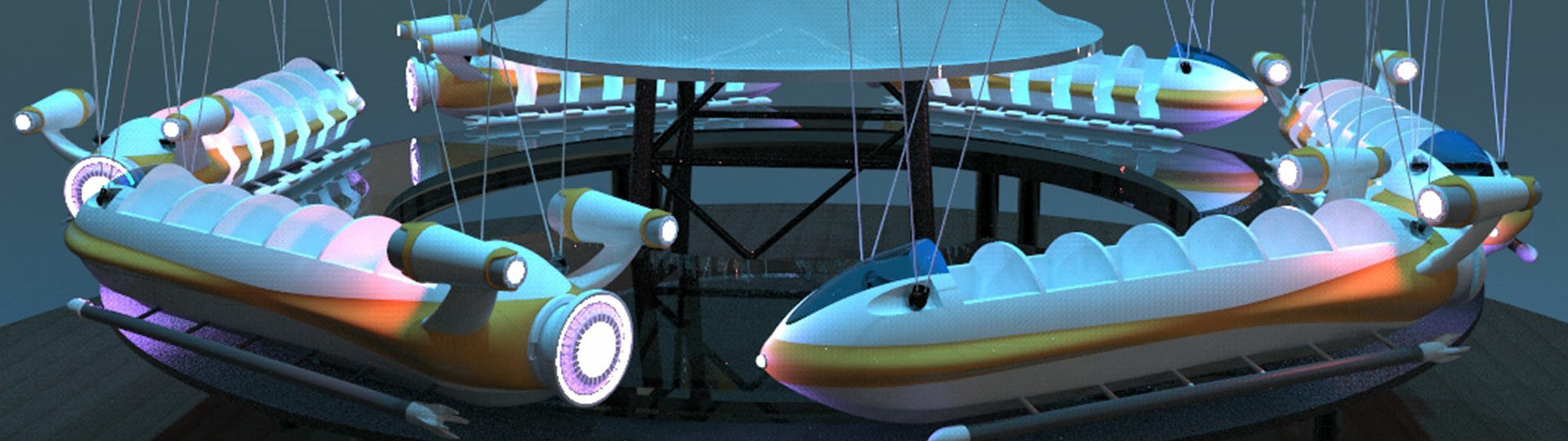 幻速追影六個(gè)飛機(jī)吊掛座艙隨同旋轉(zhuǎn)架相對(duì)塔體自由旋轉(zhuǎn)并外擺升起,繞中心立柱飛行,科幻又刺激。夜間智能燈光系統(tǒng)亮起,成為樂園一道的奇趣風(fēng)景線。